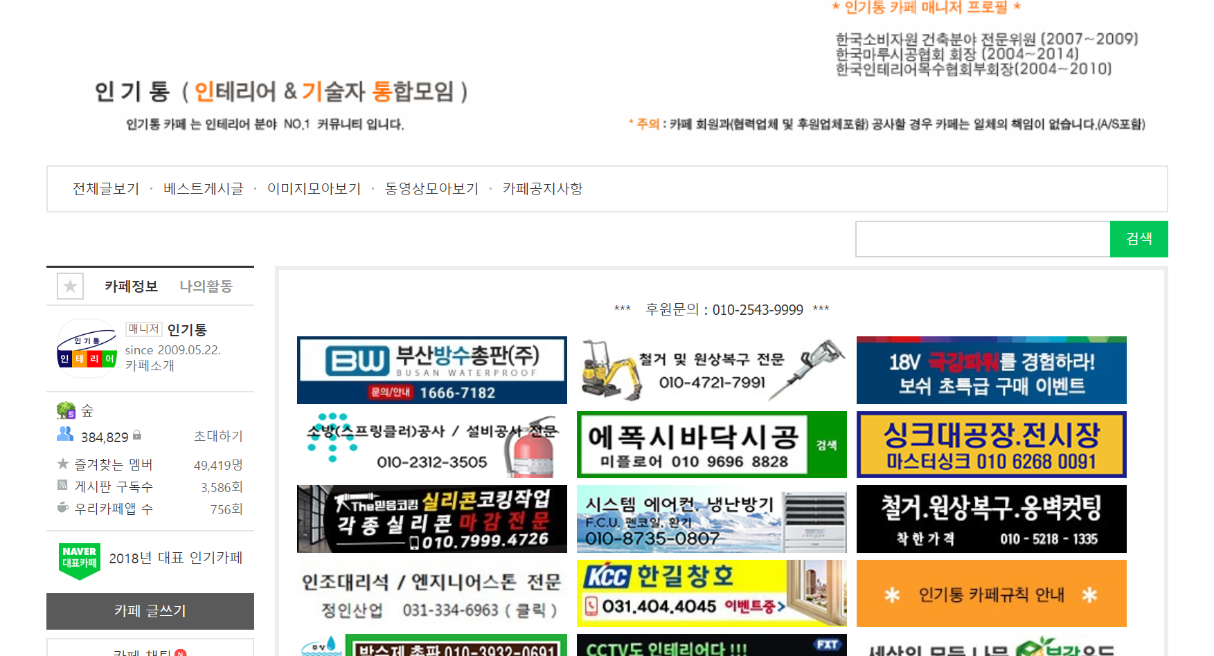 이 카페는 반셀프 인테리어를 하고자 하는 일반인보다 인테리어 사장님들이 분야별 기술자들을 쉽게 구하기 위한 사이트로 시작했습니다. 그러다 보니 어지간한 분야는 다 커버를 하고 있습니다. 사실 마음만 먹으면 이 사이트를 통해서 쉽게 인테리어를 진행할 수 도 있겠죠